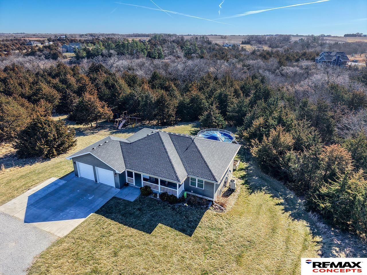 Acreage Dream at just the right price! Welcome to 2105 Myhill Lane, a beautiful 4 bedroom 3 bath ranch in Farrington Acres, Crete!  This 2.07-acre property offers the perfect blend of privacy & convenience. Nestled amoung mature trees this home provides a peaceful setting w/easy access to Hwy 33, and nearby amenities. The open-concept main level features 2 bedrooms & 2 bathrooms, including a primary suite, along w/ a spacious living and dining area, a beautiful kitchen, & a convenient laundry/mudroom w/ storage. Step out onto the deck to enjoy scenic views of your acreage. The fully finished walk-out basement expands your living space w/2 large bedrooms, a full bathroom, & a large family room/recreation area complete w/ a bar-ideal for entertaining. Outdoor living shines with a brand-new 24' above-ground pool, a pool shed & a concrete pad (2025), plus walking trails just behind the property. Enjoy the seclusion of acreage living with the benefit of public utilities, and city amenities.